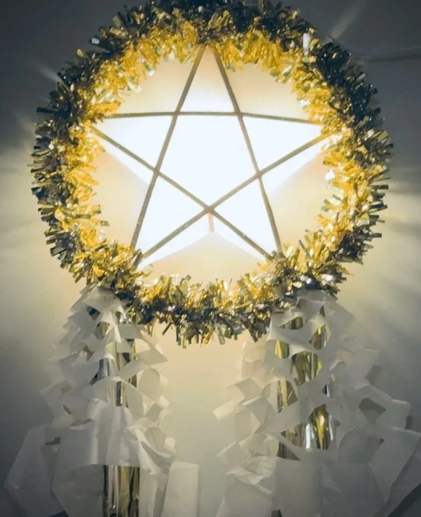 Option # 1: I purchased the SIXDEFLY Plug-in Hanging Light Kit and DEWENWILS Indoor Remote Control Outlet on Amazon. I twisted a pipe cleaner around the cord and then twisted it around the tip of one of the points of the star at the top of the parol, immediately after the wooden frame is completed. Make sure to adjust the placement of the light bulb so it hangs directly behind the center of the star. Also, using a 40-watt soft light LED light bulb or one with a lower wattage is highly recommended, as this prevents the light bulb from overheating and posing a fire hazard.